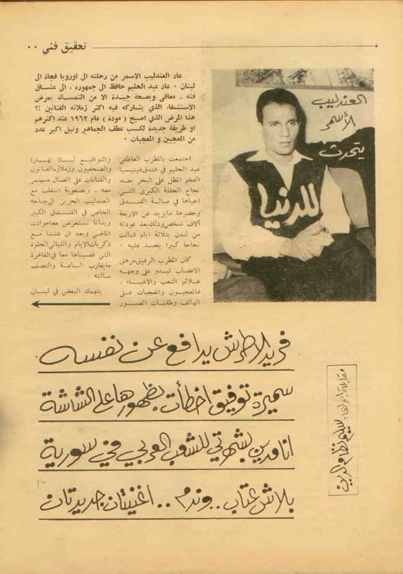 كان المطرب الرقيق مرهق الأعصاب تبدو على وجهه علائم التعب والإعياء، فالمعجبون والمعجبات على الهاتف وطلبات الصور والتواقيع ليلاً ونهاراً والصحفيون وزملاؤه الفنانون والفنانات على اتصال مستمر معه، وبصعوبة انتقلت مع العندليب الحزين إلى جناحه الخاص في الفندق الكبير وبدأنا نستعرض معاً حوادث الماضي وبعد أن عشنا مع ذكريات الأيام والليالي الحلوة التي قضيناها معاً في القاهرة ما يقارب الساعة والنصف