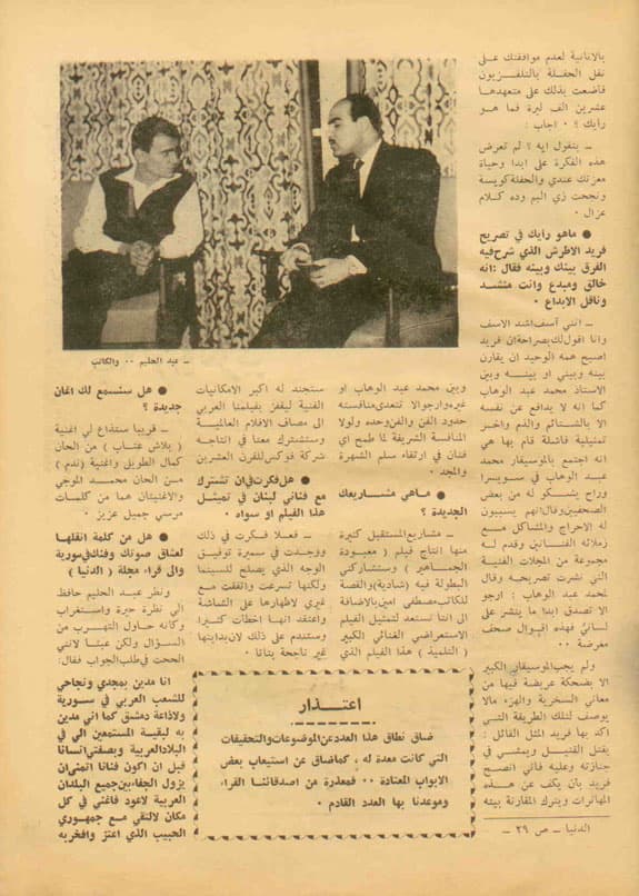 إنني آسف أشد الأسف وأنا أقول لك بصراحة أن فريد أصبح همه الوحيد أن يقارن بينه وبيني أو بينه وبين الأستاذ محمد عبد الوهاب كما أنه لا يدافع عن نفسه إلا بالشتائم والذم وآخر تمثيلية فاشلة قام بها هي أنه اجتمع بالموسيقار محمد عبد الوهاب في سويسرا وراح يشكو له من بعض الصحفيين وقال أنهم يسببون له الإحراج والمشاكل مع زملائه الفنانين وقدم له مجموعة من المجلات الفنية التي نشرت تصريحه وقال لمحمد عبد الوهاب: أرجو ألا تصدق أبداً ما ينشر على لساني فهذه أقوال صحف مغرضة...