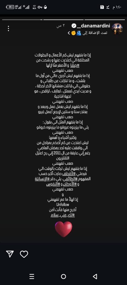 وفي ختام الرسالة، توجّهت دانا بكلمات واضحة للمتابعين الذين لا يفهمون خلفية اختياراتها، قائلة: "إذا لهلأ ما عم تفهمني، Unfollow... أخرج منها فأنت آمن، لك مني سلام".