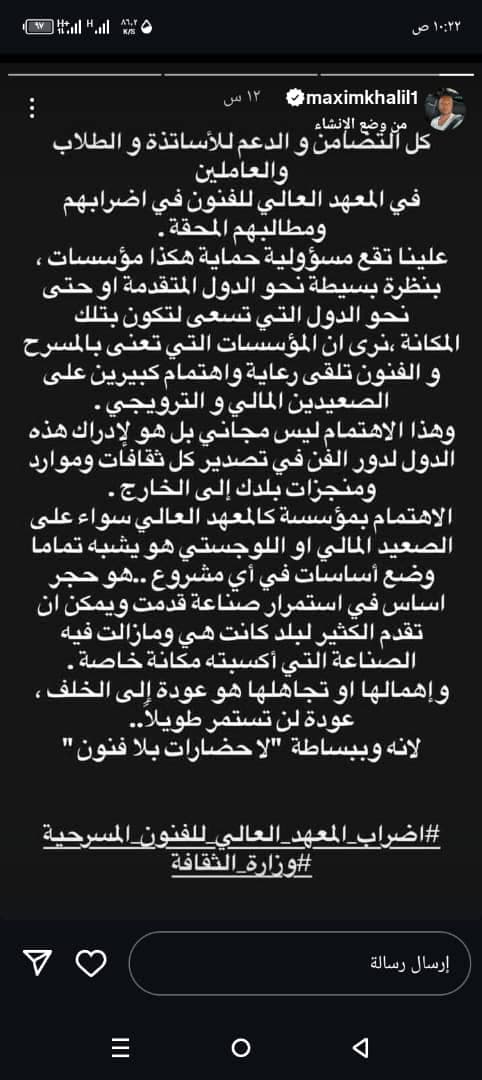 الفنان السوري مكسيم خليل شارك في هذا الحراك، حيث عبر عن تضامنه مع الأساتذة والطلاب عبر منشور على إنستغرام، مؤكدًا على أهمية حماية المعاهد الثقافية والفنية ودورها الحيوي في نقل الثقافة والفن إلى العالم. وقال مكسيم: "كل التضامن والدعم للأساتذة والطلاب والعاملين في المعهد العالي للفنون المسرحية في إضرابهم ومطالبهم المحقة، علينا تقع مسؤولية حماية هكذا مؤسسات.. لدور الفن في تصدير كل ثقافات وموارد ومنجزات البلد للخارج."