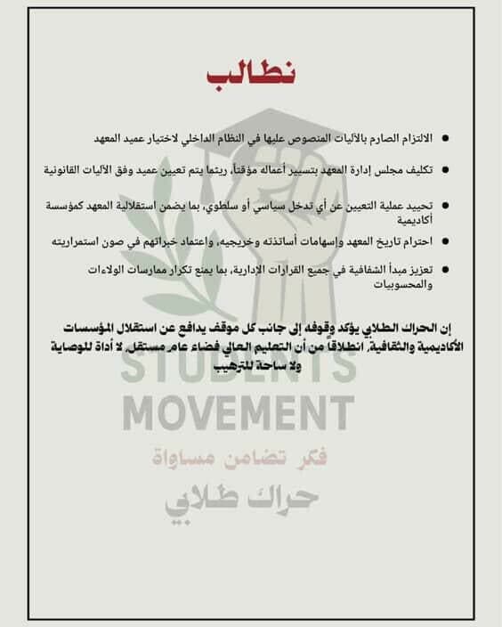 وقد طالب الحراك الطلابي بضرورة احترام تاريخ المعهد وتقدير جهود أساتذته، مع الإصرار على أن يتم تعيين عميد جديد وفق آليات قانونية من شأنها أن تحفظ استقلالية المعهد وتضمن استمرارية العملية التعليمية بعيدًا عن التدخلات السياسية.