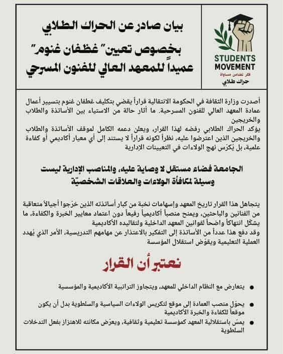 على الصعيد الآخر، عبّر الطلاب عن احتجاجهم الشديد، محذرين من أن القرار يهدد تاريخ المعهد وإسهاماته الأكاديمية. كما أكدوا أن هذا التعيين يشجع على المحسوبية والولاءات الشخصية على حساب الكفاءة العلمية والقدرات الأكاديمية.