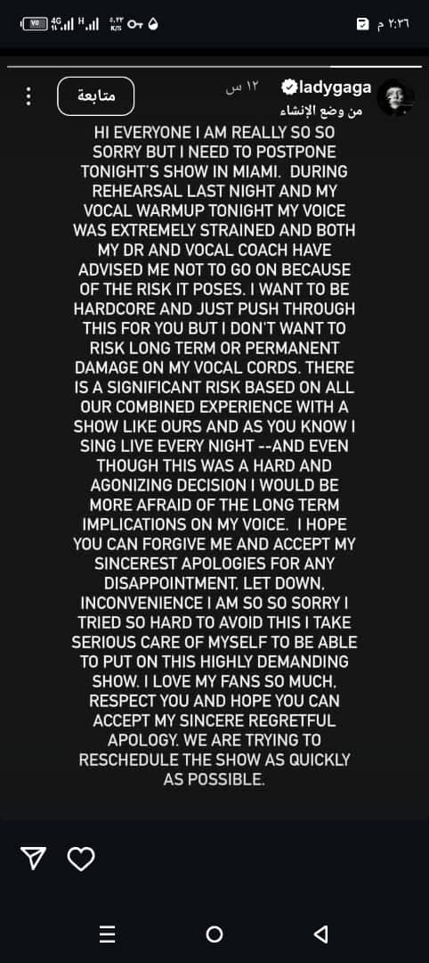 غاغا أعربت عن أسفها الشديد لهذا القرار الذي وصفته بـ"الصعب والمؤلم"، مؤكدة أنها حاولت جاهدة تفادي هذا الموقف وأنها تحرص على صحتها كي تتمكن من الاستمرار في تقديم العروض المقبلة.