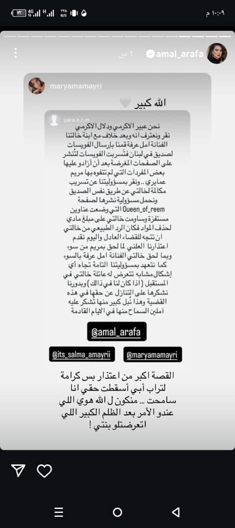 قدمت عبير ودلال الأكرمي، أولاد شقيقة الفنانة أمل عرفة، اعتذارًا رسميًا بعد تسريب تسجيل صوتي يعود لابنتها مريم عمايري، وذلك عبر بيان نشرتهما اليوم.