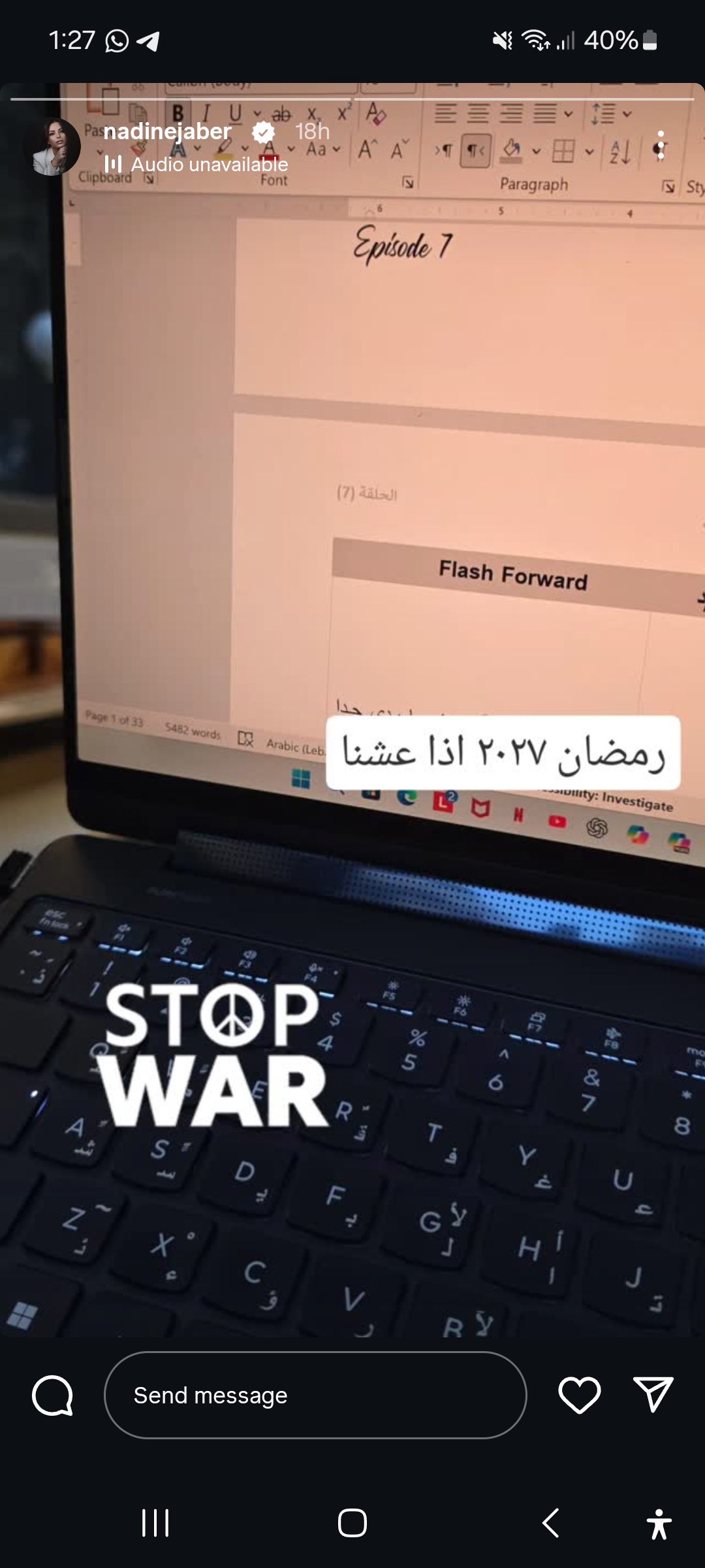 أعلنت ندين جابر عبر حسابها على “Instagram” أنها وصلت إلى الحلقة السابعة من الكتابة، مرفقةً ذلك بعبارة «إذا عشنا»، في إشارة تحمل أبعاداً مرتبطة بالظروف الراهنة، ما أضفى طابعاً إنسانياً على بداية المشروع.