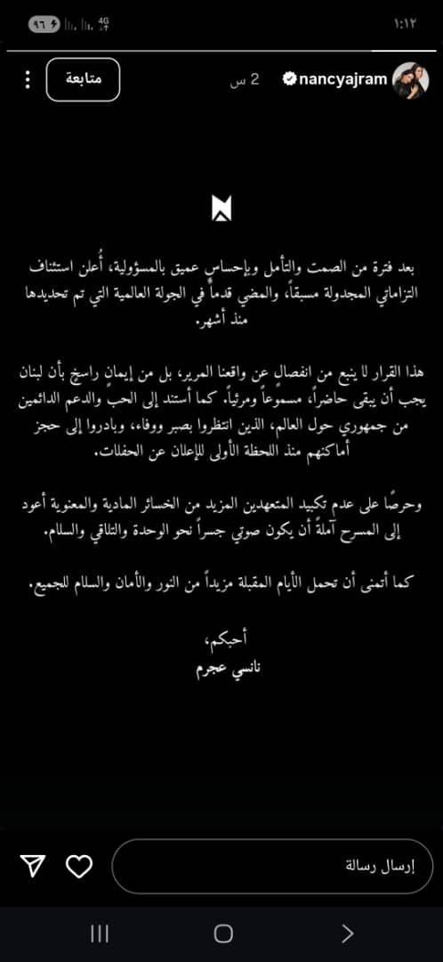 في رسالتها، شددت نانسي عجرم على أن استئناف الجولة لا يتعارض مع تضامنها مع لبنان، بل يعكس رغبتها في الاستمرار بنقل صوتها إلى العالم.