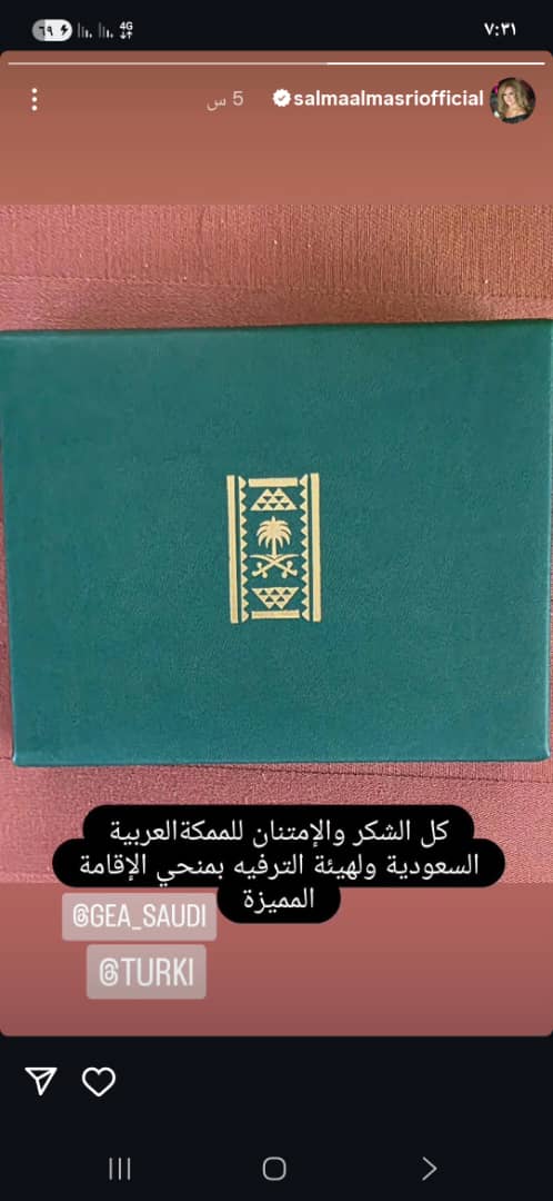عبّرت سلمى المصري عن سعادتها بهذا التكريم، حيث شاركت صورة لعلبة فاخرة تحمل شعار المملكة عبر خاصية الستوري، ووجّهت رسالة شكر إلى الهيئة العامة للترفيه، مؤكدةً تقديرها لهذه المبادرة.