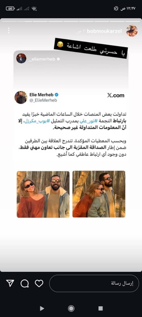 حسمت الفنانة نور علي والمخرج اللبناني بوب مكرزل الجدل حول طبيعة علاقتهما، بعد انتشار شائعات عبر مواقع التواصل الاجتماعي تحدثت عن ارتباط عاطفي بينهما خلال الساعات الماضية.